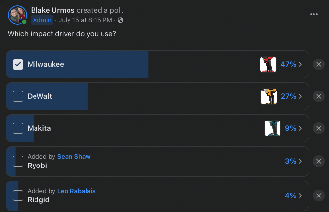 We ran a poll in the Low Voltage Nation Facebook Group for "which impact driver do you use?"