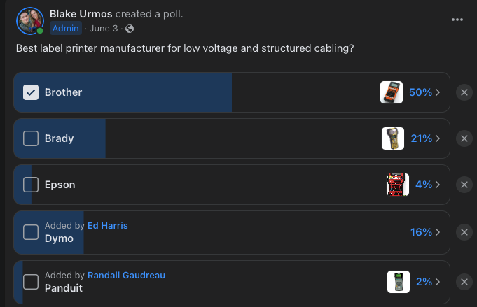 We ran a poll in the Low Voltage Nation Facebook Group for "which label printer do you use?"